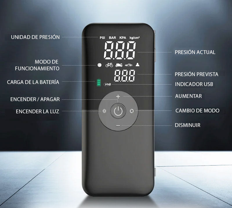 - Práctico: Con solo unos toques, puede inflar sus llantas rápidamente y sin esfuerzo.